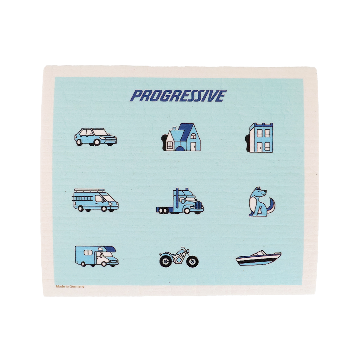 Imprint: Progressive logo above a grid of illustrated icons, including a car, house, apartment building, work van, semitruck, dog, motor home, motorcycle, and boat